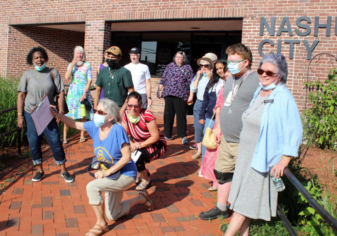 Telegraph photo by DEAN SHALHOUP The group of organizers and volunteers who gathered signatures for a petition to get a city charter amendment on the Nov. 2 ballot gather at the Elm Street entrance to City Hall after delivering the petitions last week. (Telegraph photo by DEAN SHALHOUP)