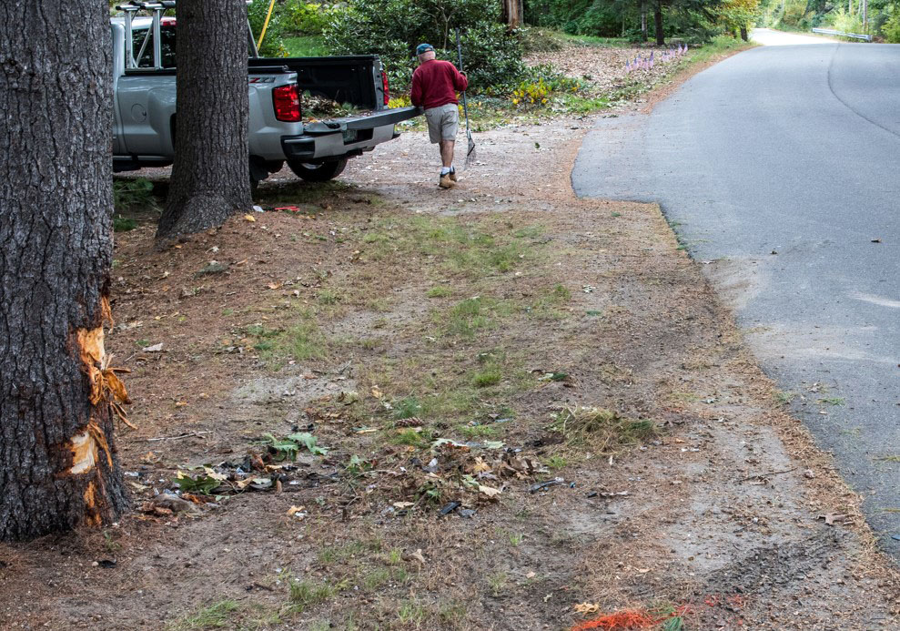 Photo by JEFFREY HASTINGS A man with a rake stopped at the scene of the crash last week on Thornton Ferry Road I in Amherst that left a passenger with serious head injuries. The driver was unhurt but was cited for prohibited use of a mobile device and operating without a license, police said. (Photo by JEFFREY HASTINGS)