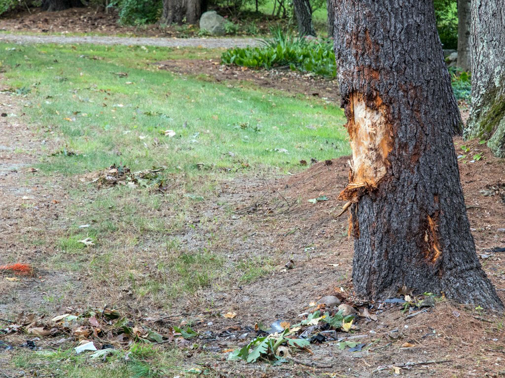 Photo by JEFFREY HASTINGS The damaged tree and debris on the grouind mark the scene of the weekend crash in Amherst that left a passenger with serious head injuries. The driver was unhurt but was cited for prohibited use of a mobile device and operating without a license, police said. (Photo by JEFFREY HASTINGS)