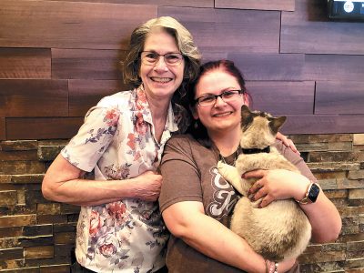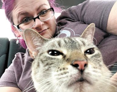Getting reacquainted didn’t take long, and soon there were lots of smiles, some happy tears, and a few head butts. Castiel then snuggled up next to McCuiston in the car for the ride back to Hudson to meet up with his old buddy, Millicent, and get to know his three new feline friends, Blue Cheese, Lilith and Ruby Jo.