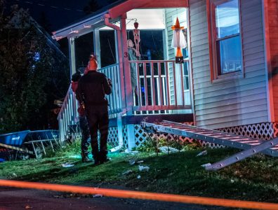 Photo by JEFFREY HASTINGS A police officer speaks with an Eversource lineman in front of the Derry house where two men were electrocuted when the ladders they were using contacted power lines. (Photo by JEFFREY HASTINGS)