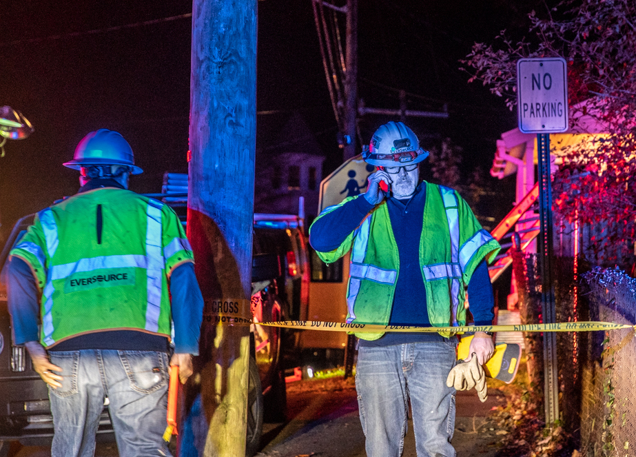 - Photo by JEFFREY HASTINGS A police officer speaks with an Eversource lineman in front of the Derry house where two men were electrocuted when the ladders they were using contacted power lines. (Photo by JEFFREY HASTINGS)