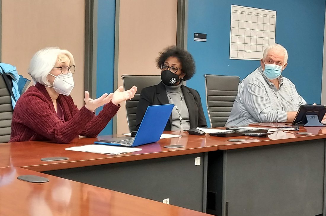 Telegraph photo by DEAN SHALHOUP Board of Health member Stephanie Wolf-Rosenblum makes a point while addressing attendees at Wednesday's meeting. Looking on are Department of Public Health and Community Services director Bobbie Bagley and board chairman Anthony Storace. (Telegraph photo by DEAN SHALHOUP)