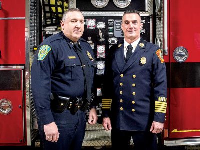 New Nashua Police Chief Kevin Rourke stand with new Nashua Fire Rescue Chief Steve Buxton after both were sworn in to their new positions on Wednesday. Photo by JEFFREY HASTINGS