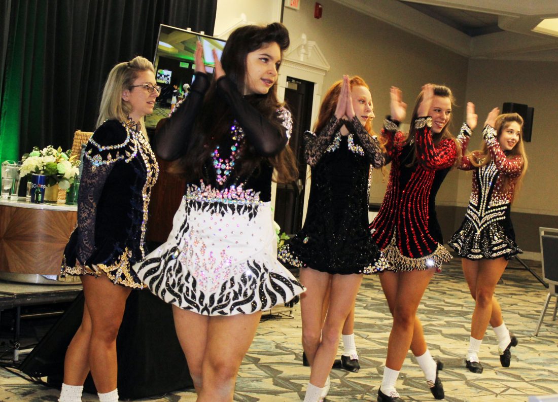 Irish step dancers from the McGonagle School of Irish Dance perform at the outset of Thursday's PLUS Company Wild Irish Breakfast, which took place before an in-person and virtual audience at the DoubleTree Hilton in Nashua.