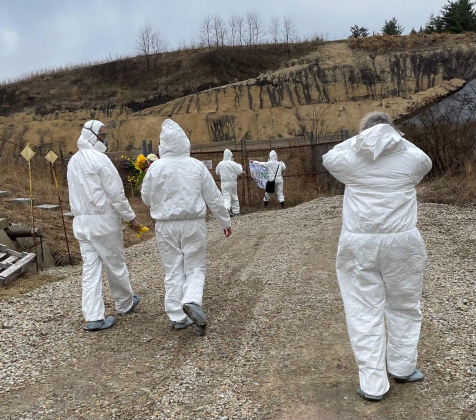 BOW – On Saturday, Nine New England activists held a Healing Ceremony at the ash disposal site for the Merrimack Station in Bow, NH, the last coal plant in the region. Dressed in tyvek suits and respirators, they gathered to honor the Earth and heal the desecration caused by the dumping of toxic coal ash. After decorating the fence with flowers and posters, the activists performed the “Elm Dance”- a Latvian ceremony originally created for the healing of Chernobyl.