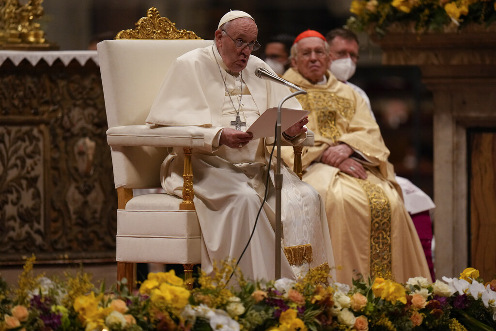 Pope Francis presides over a Easter vigil ceremony in St. Peter's Basilica at the Vatican, Saturday, April 16, 2022. (AP Photo/Alessandra Tarantino)