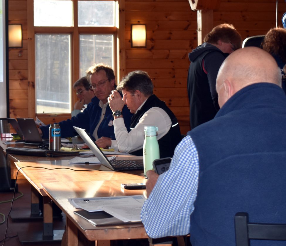 Gunstock Area Commission members, from left, Doug Lambert, Dr. David Strang, Peter Ness, and Gary Kiedaisch (with back to camera) during an April 20 meeting. (Tom Caldwell Photo)