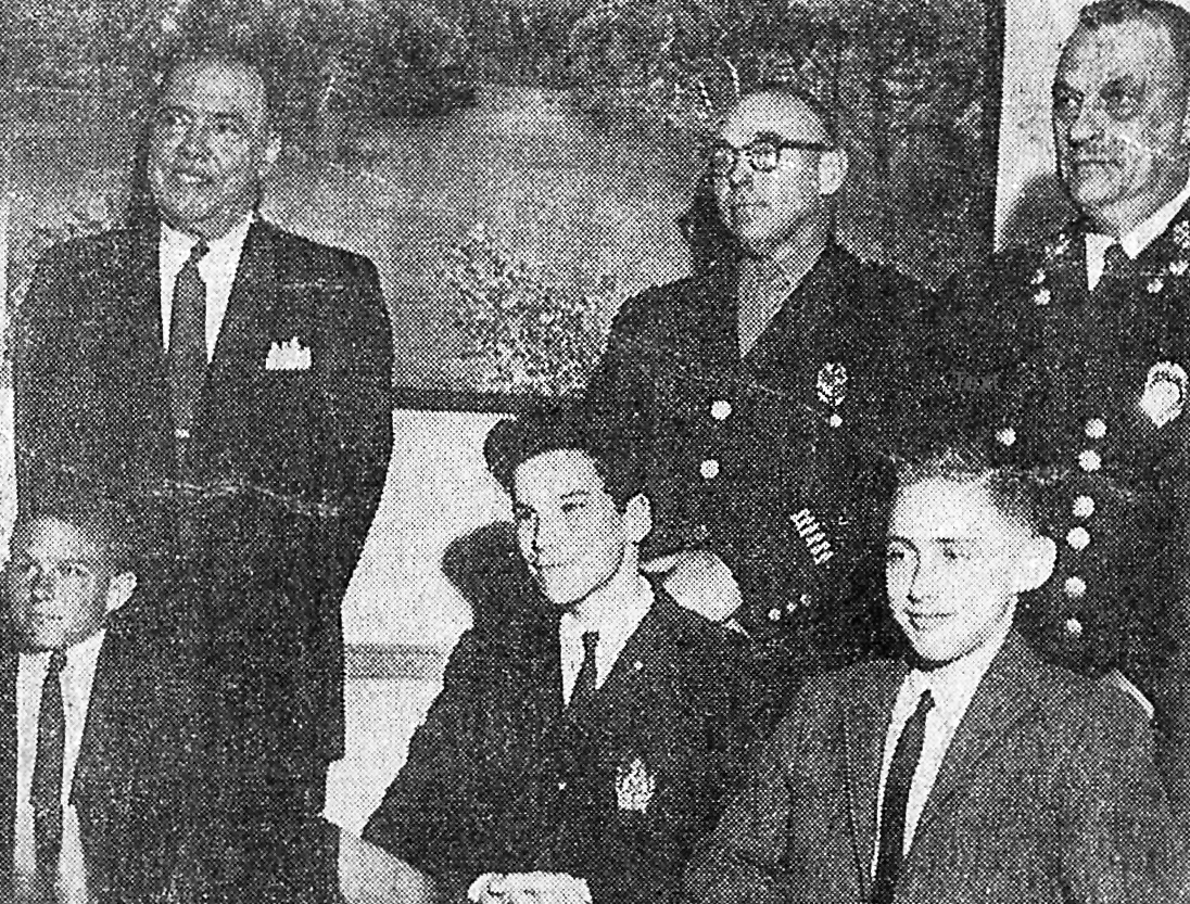 (Telegraph file photo) The three Spring Street Junior High "Officers for a Day" were photographed with their adult counterparts after their classmates elected them in May 1962. From left are Mark Hogan, seated in front of Mayor Mario J. Vagge; Bruce Jasper, in front of Deputy Police Chief John Webster; and Thomas Hall, in front of Fire Chief Albert L. Tanguay. Webster stood in for Chief Paul J. Tracy, who was unavailable.