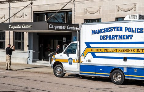 - (Photo by JEFFREY HASTINGS) Manchester police detectives conduct their investigation into Friday’s stabbing death at the Carpenter Center apartment building. A suspect, identified as Stephanie Beard, 34, was arrested Saturday in Boston.