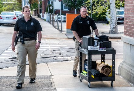 (Photo by JEFFREY HASTINGS) Manchester detectives wheel an evidence cart to the scene of the weekend fatal stabbing at the Carpenter Center apartment building, for which Stephanie Beard, age 34, was arrested Saturday on second-degree murder.