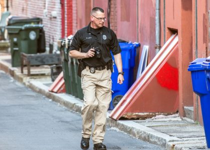(Photo by JEFFREY HASTINGS) A Manchester detective takes photos of areas around the Carpenter Center apartment building Friday during the investigation into the stabbing death of a 71-year-old man, for which a suspect was arrested Saturday.