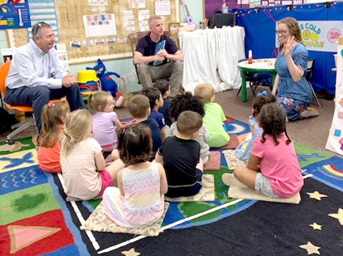 Connor Jennings, community relations specialist from Eversource Energy, recently visited the YMCA of Greater Nashua’s Early Education Center at the Merrimack YMCA. In addition to a tour of the Y’s facility, he took a few minutes to read a book to students in the Y’s Wildcat Preschool Room, where Mia Pellerinis the lead teacher. Eversource Energy has supported the Y’s annual campaign with a $1,500 gift toward scholarship assistance for children to attend the Early Education Center. Pictured, from left, are YMCA CEO Mike LaChance, Jennings from Eversource Energy and YMCA teacher Pellerin.