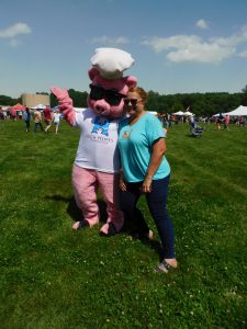 High Hopes Foundation volunteer event mascot Lisa Rourke, of Nashua, greets Michelle West, of Merrimack, at the sixth annual bacon-and-beer festival. (Photo by Loretta Jackson)