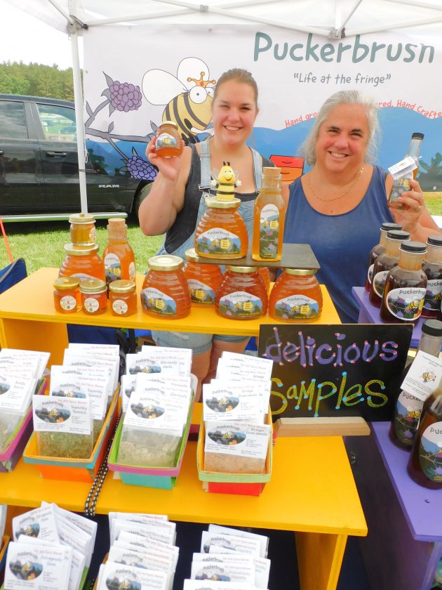 Tiegan Gilmore, left, and her mom, Linda Gilmore, representing Puckerbrush, of Littleton, offer ‘hand grown, hand gathered, hand crafted’ goods including honey, spices and other barbecue fixings. (Photo by Loretta Jackson)