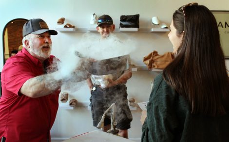 (Telegraph photo by DEAN SHALHOUP) Mark McCabe, of Subzero Nitrogen Ice Cream, amuses a visitor with a bowl of vapor created by flash-freezing ingredients with liquid nitrogen, which turns them into ice cream in moments. McCabe was set up inside Camaraderie for Wednesday's Taste of Downtown Nashua.