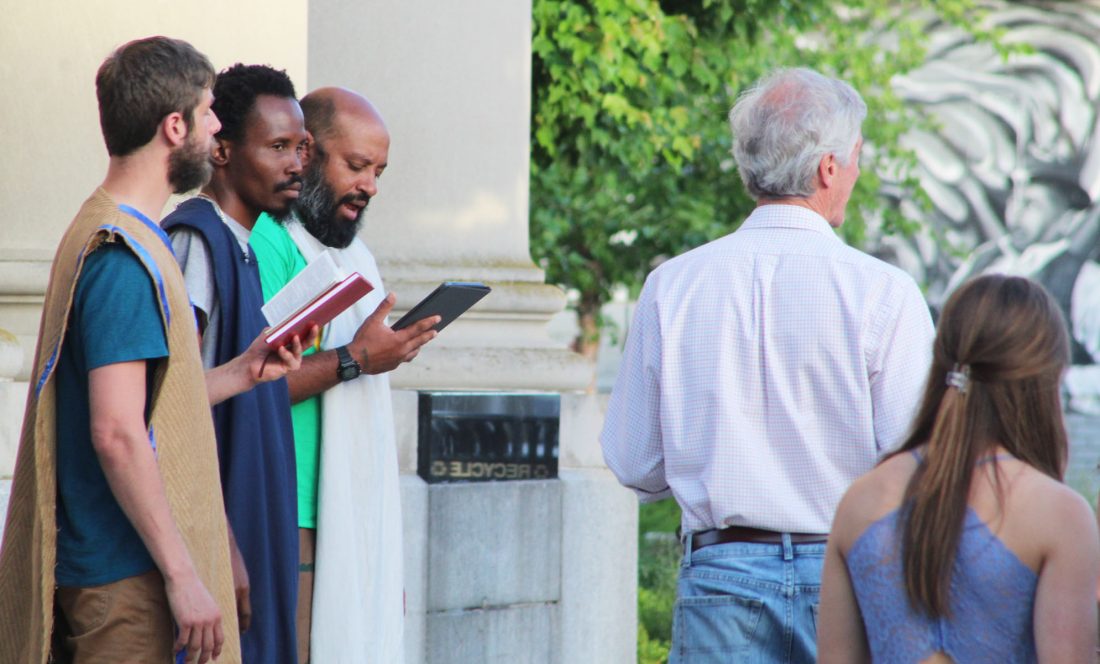 (Telegraph photo by DEAN SHALHOUP) A couple walks past a trio of street preachers, who stationed themselves in front of 146 Main St. during Wednesday evening's Taste of Downtown Nashua.