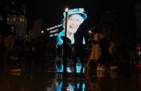 - People pass by an image of Queen Elizabeth II projected onto a large screen at Piccadilly Circus, in London, Thursday, Sept. 8, 2022. Queen Elizabeth II, Britain’s longest-reigning monarch and a rock of stability across much of a turbulent century, died Thursday after 70 years on the throne. She was 96. (AP Photo/Alberto Pezzali)