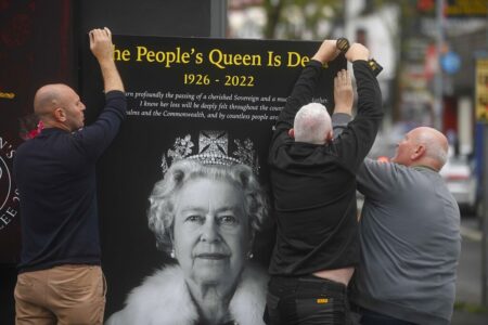 - Council workers and local community representatives hang a mural on a wall on Crimea street off the Shankill road in Belfast following the death of Queen Elizabeth II, Friday Sept. 9, 2022. The country began a 10-day mourning period Friday, with bells tolling around Britain and 96 gun salutes planned in London – one for each year of the queen’s long life. People around the globe gathered at British embassies to pay homage to the queen, who died Thursday in Balmoral Castle in Scotland. (Mark Marlow/PA via AP)
