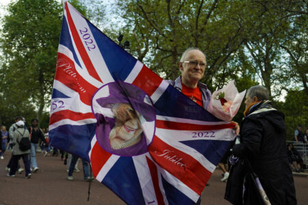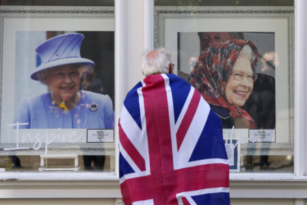 - A mourner with flowers and a Union Jack with the Queen’s image walks towards Buckingham Palace in London, Friday, Sept. 9, 2022. Queen Elizabeth II, Britain’s longest-reigning monarch and a rock of stability across much of a turbulent century, died Thursday Sept. 8, 2022, after 70 years on the throne. She was 96. (AP Photo/Alberto Pezzali)