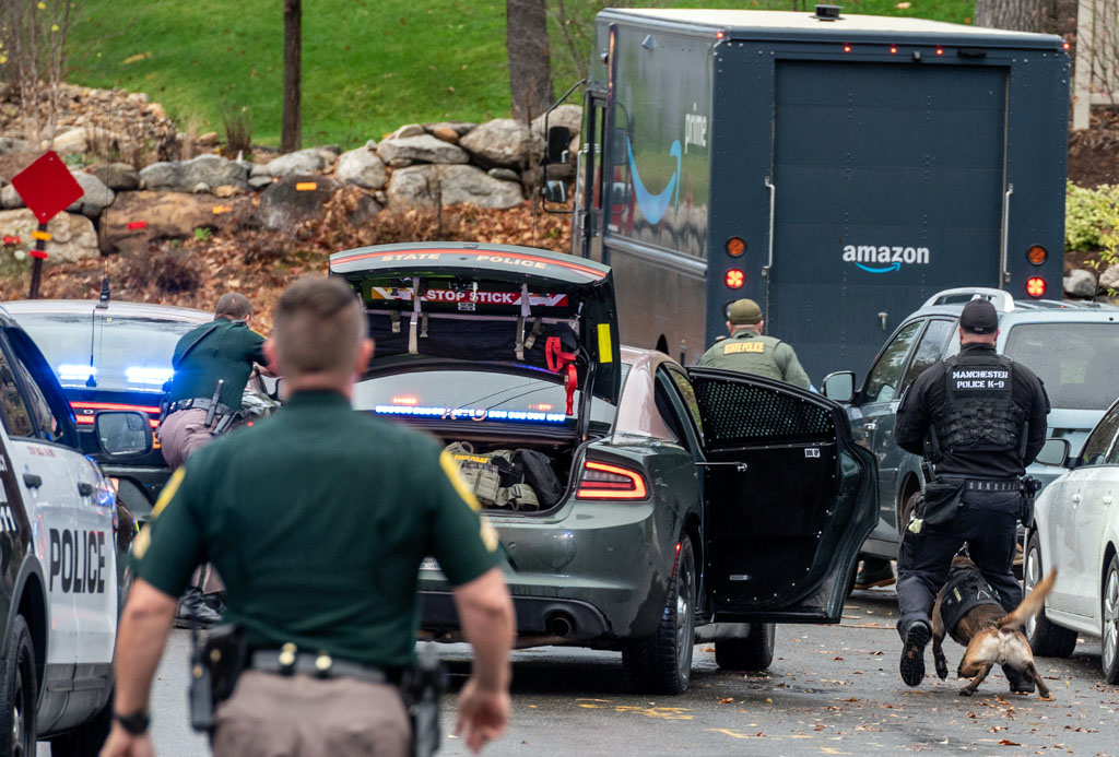 - (Photo by JEFFREY HASTINGS) State troopers and a Manchester K9 team, at right, move into position as they surround the Amazon Prime delivery truck that ended up at a dead-end street in Manchester after being stolen from Concord Sunday afternoon. The suspect was taken into custody after a brief battle with officers — and the K9.