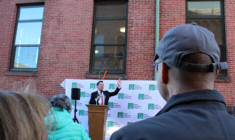 - (Telegraph photo by DEAN SHALHOUP) Nashua Soup Kitchen & Shelter executive director Mike Reinke welcomes the 100 or so people who attended Thursday’s grand opening celebration of the agency’s new emergency shelter at 35 Spring St.