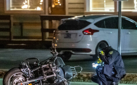 - (Photo by JEFFREY HASTINGS) An investigator inspects the motorcycle that collided with a car Monday evening, claiming the life of Hudson Fire Lt. Todd Berube.
