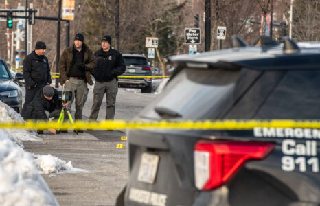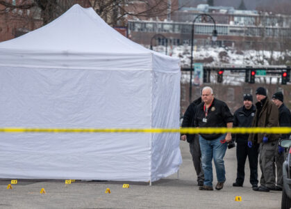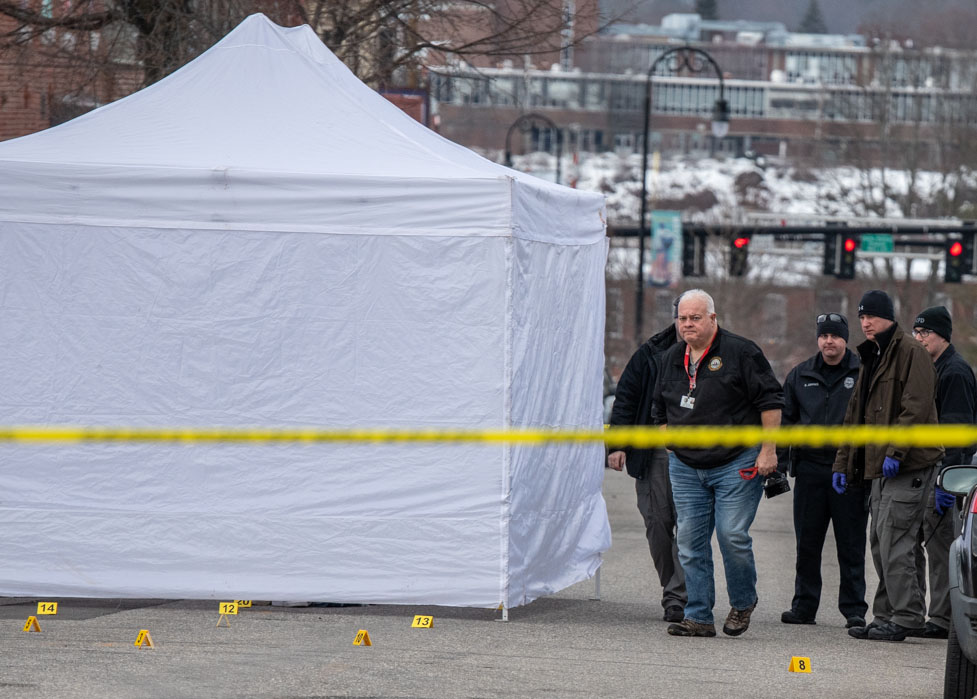 By daylight Saturday, a large area covering a city block was taped off while police processed the scene. Pouliot’s covered body remained at the scene until mid-morning as detectives searched for, and recovered, evidence.