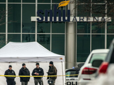 (Photo by JEFFREY HASTINGS) Police investigating the fatal Saturday morning shooting outside The Goat bar and grill on Old Granite Street gather next to the tent that was set up to protect the scene, which is across the street from the SNHU Arena.
