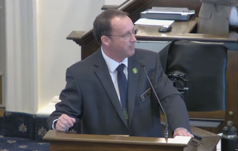 Rep. Kevin Verville, R-Deerfield, speaks in favor of two bills to legalize drugs at Thursday's House session.