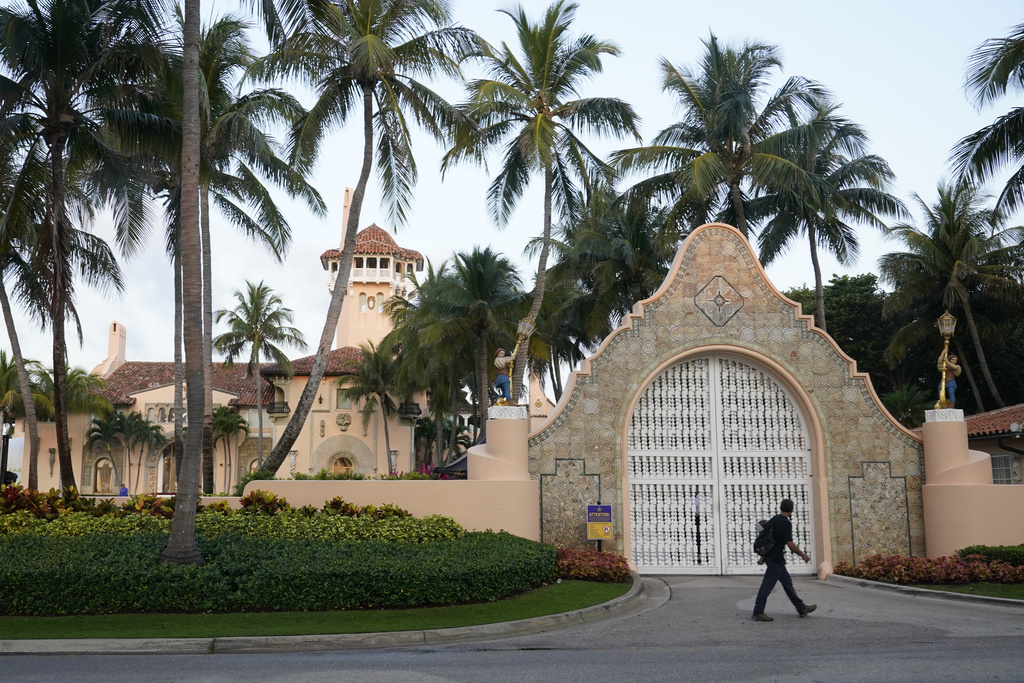 A pedestrian walks by the entrance of the Mar-a-Lago club, Monday, April 3, 2023, in Palm Beach, Fla. Former President Donald Trump is expected to travel to New York to face charges related to hush money payments. Trump is facing multiple charges of falsifying business records, including at least one felony offense, in the indictment handed up by a Manhattan grand jury. (AP Photo/Marta Lavandier)
