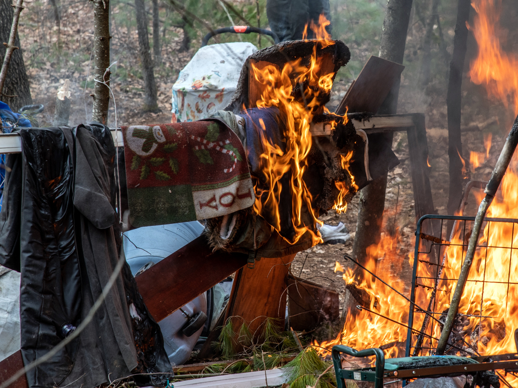 Blankets, clothing and other items go up in flames as fire swept through a homeless encampment near the Manchester-Goffstown line Tuesday morning.