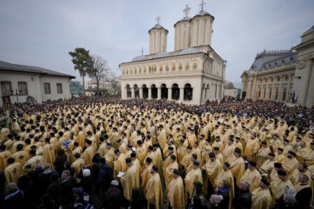 - Romanian Orthodox priests and believers stand outside the Patriarchal Cathedral after an Orthodox Palm Sunday pilgrimage in Bucharest, Romania, Saturday, April 8, 2023. According to local media hundreds of priests and Orthodox worshippers marched through the Romanian capital and major cities ahead of Palm Sunday. (AP Photo/Andreea Alexandru)