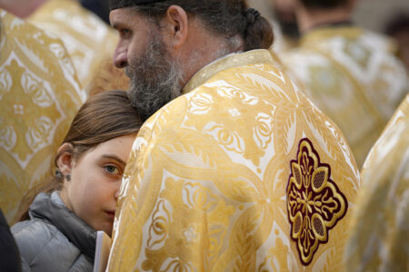 - A girl leans on a Romanian orthodox priest before an Orthodox Palm Sunday pilgrimage in Bucharest, Romania, Saturday, April 8, 2023. According to local media hundreds of priests and Orthodox worshippers marched through the Romanian capital and major cities ahead of Palm Sunday. (AP Photo/Andreea Alexandru)