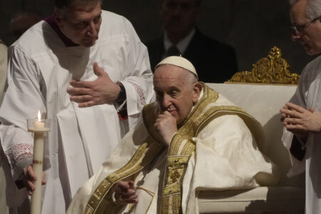 - Pope Francis presides over an Easter vigil ceremony in St. Peter’s Basilica at the Vatican, Saturday, April 8, 2023. (AP Photo/Gregorio Borgia)
