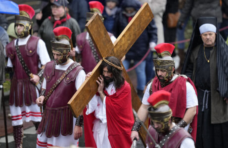 - An actor portraying the part of Jesus Christ, carries the cross during the Good Friday procession in the city center of Wuppertal, Germany, Friday, April 7, 2023. Christians around the world are commemorating Good Friday, marking the crucifixion of Jesus Christ. (AP Photo/Martin Meissner)