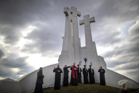 - Archbishop Gintaras Grusas, center, speaks during the Holy Week procession at the Three Crosses hill in Vilnius, Lithuania, Friday, April 7, 2023. Holy Week commemorates the last week of the earthly life of Jesus Christ culminating in his crucifixion on Good Friday and his resurrection on Easter Sunday. (AP Photo/Mindaugas Kulbis)