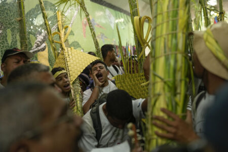 - Members of the Palmeros de Chacao brotherhood, chant and sing, as they arrive with palm branches after descending the Cerro el Avila, in Caracas, Venezuela, Saturday, April 1, 2023. Every year the brothers climb the Cerro El Avila to collect the royal palm branches as part of a 250-year tradition that marks the start of Holy Week. The palms will be blessed at the Palm Sunday Mass in the Chacao church. (AP Photo/Matias Delacroix)