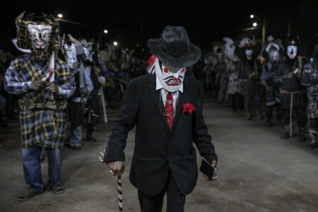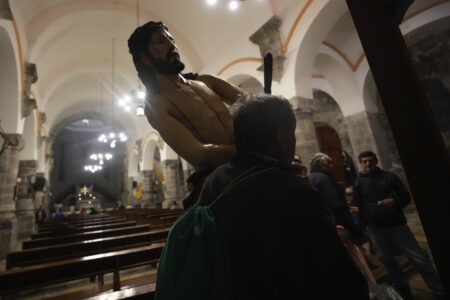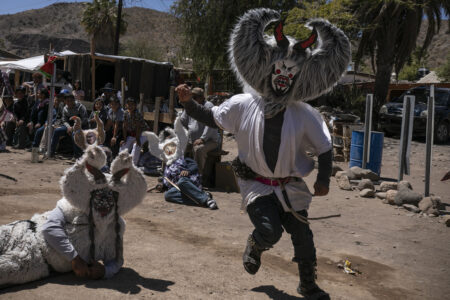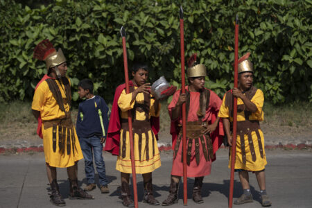 In Bolivia’s highland region, artists gathered for an annual event where they built sand sculptures based on Bible stories. Members of the faithful in Brazil wore tunics and hoods to take part in the Procession of Souls in Goiás state. And in Managua, Nicaragua, a child dressed as an angel during an event observing Good Friday, during which a masked worshipper held a religious banner depicting Jesus Christ on a cross.