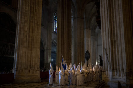 - Penitents from “La Candelaria” brotherhood walk across the Seville cathedral as they takes part in a procession, Spain, Tuesday, April 4, 2023. Hundreds of processions take place throughout Spain during the Easter Holy Week. (AP Photo/Emilio Morenatti)
