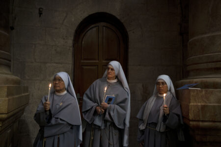 - Catholic nuns hold candles during the Holy Thursday procession at the Church of the Holy Sepulcher, the site where according to tradition Jesus was crucified and buried, in the Old City of Jerusalem, Thursday, April 6, 2023. (AP Photo/Maya Alleruzzo)