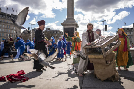 - The Passion of Jesus is performed to crowds in Trafalgar Square, London, Friday, April 7, 2023 on Good Friday by actors from the Wintershall Players. (Aaron Chown/PA via AP)