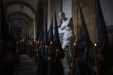 - Penitents of “Los Estudiantes” brotherhood gather in one of the courtyards of the University of Seville before starting the procession, Spain, Tuesday, April 4, 2023. Hundreds of processions take place throughout Spain during the Easter Holy Week. (AP Photo/Emilio Morenatti)