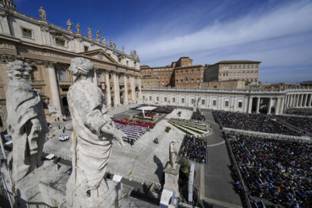 - A view of the Palm Sunday’s mass celebrated by Pope Francis in St. Peter’s Square at The Vatican Sunday, April 2, 2023 a day after being discharged from the Agostino Gemelli University Hospital in Rome, where he has been treated for bronchitis, The Vatican said. The Roman Catholic Church enters Holy Week, retracing the story of the crucifixion of Jesus and his resurrection three days later on Easter Sunday. (AP Photo/Andrew Medichini)