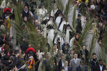 - Palm bearers arrive in a procession at the start of the Palm Sunday’s mass celebrated by Pope Francis in St. Peter’s Square at The Vatican Sunday, April 2, 2023 a day after being discharged from the Agostino Gemelli University Hospital in Rome, where he has been treated for bronchitis, The Vatican said. The Roman Catholic Church enters Holy Week, retracing the story of the crucifixion of Jesus and his resurrection three days later on Easter Sunday. (AP Photo/Gregorio Borgia)