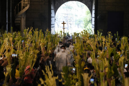 - Catholic devotees wave their palm fronds during rites to commemorate Palm Sunday, which marks the entry of Jesus Christ into Jerusalem, Sunday, April 2, 2023 in Manila, Philippines. More devotees have flocked to churches after COVID restrictions the past couple of years prevented many from joining traditional Palm Sunday rites as this largely Roman Catholic nation enters the observance of Holy Week. (AP Photo/Aaron Favila)