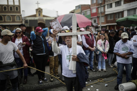 - A devotee holds a cross and an image of Jesus Christ during a Good Friday procession in the Ciudad Bolivar neighborhood of Bogota, Colombia, Friday, April 7, 2023. Holy Week commemorates the last week of the earthly life of Jesus culminating in his crucifixion on Good Friday and his resurrection on Easter Sunday. (AP Photo/Ivan Valencia)