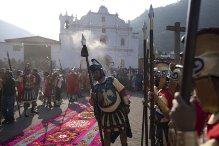 - Faithful dressed as Roman soldiers take part in a Holy Thursday procession outside the San Cristobal el Bajo Catholic church, in Antigua, Guatemala, Thursday, April 6, 2023. (AP Photo/Moises Castillo)