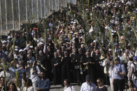 - Christians walk in the Palm Sunday procession on the Mount of Olives in east Jerusalem, Sunday, April 2, 2023. The procession observes Jesus’ entrance into Jerusalem in the time leading up to his crucifixion, which Christians mark on Good Friday. (AP Photo/Mahmoud Illean)