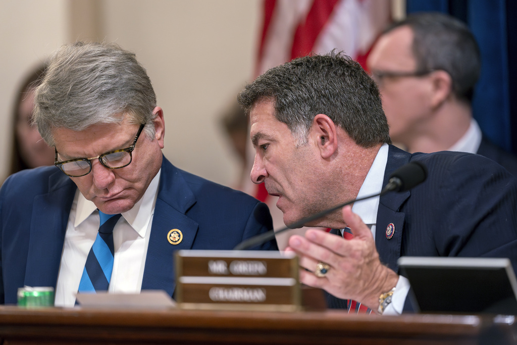 Chairman Mark Green, R-Tenn., right, confers with Rep. Michael McCaul, R-Texas, left, as Republicans on the Homeland Security Committee move to impeach Secretary of Homeland Security Alejandro Mayorkas over the crisis at the U.S.-Mexico border, at the Capitol in Washington, Tuesday, Jan. 30, 2024. (AP Photo/J. Scott Applewhite)